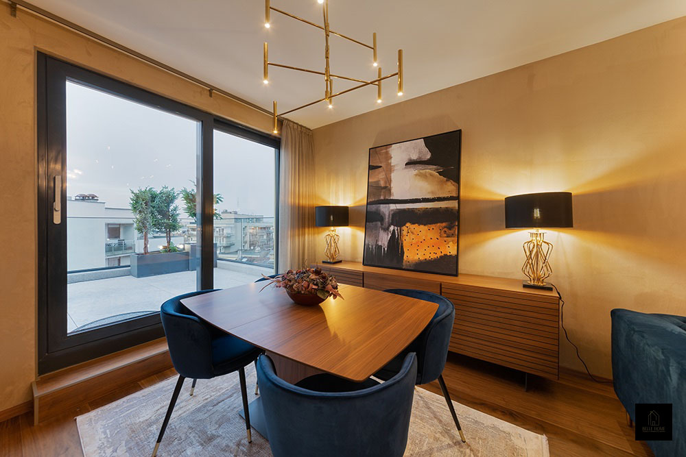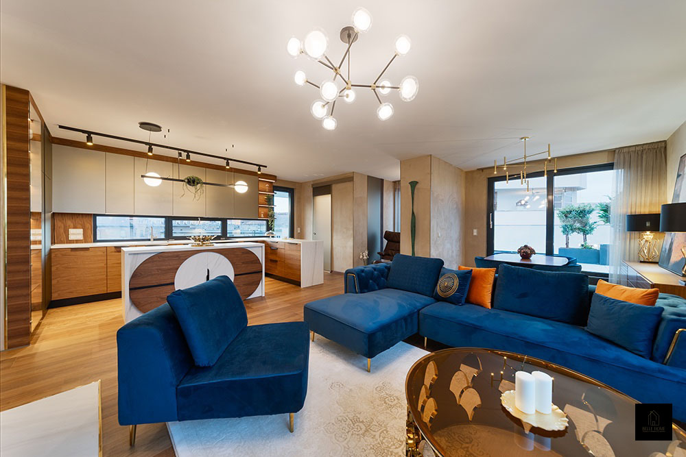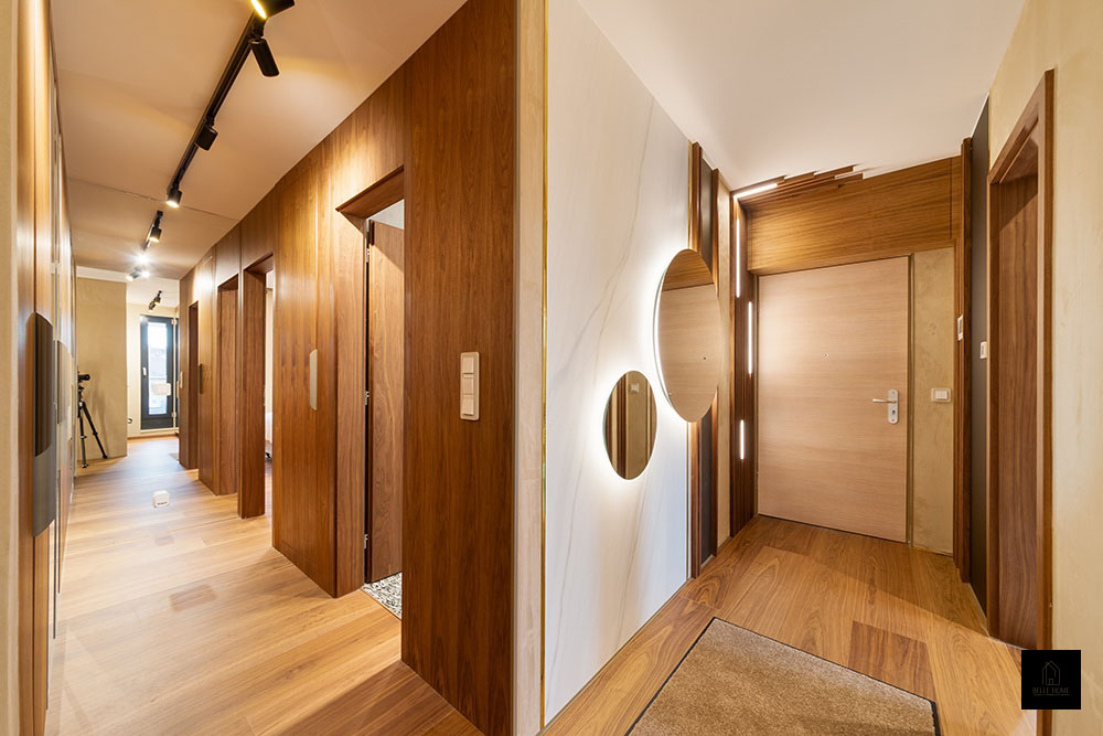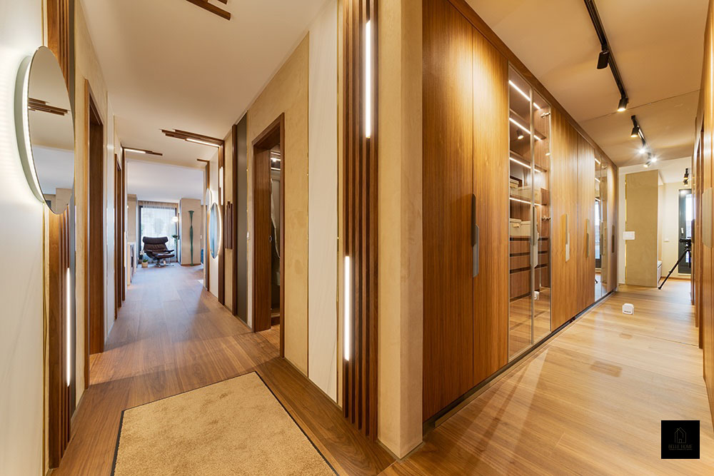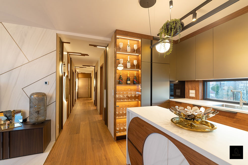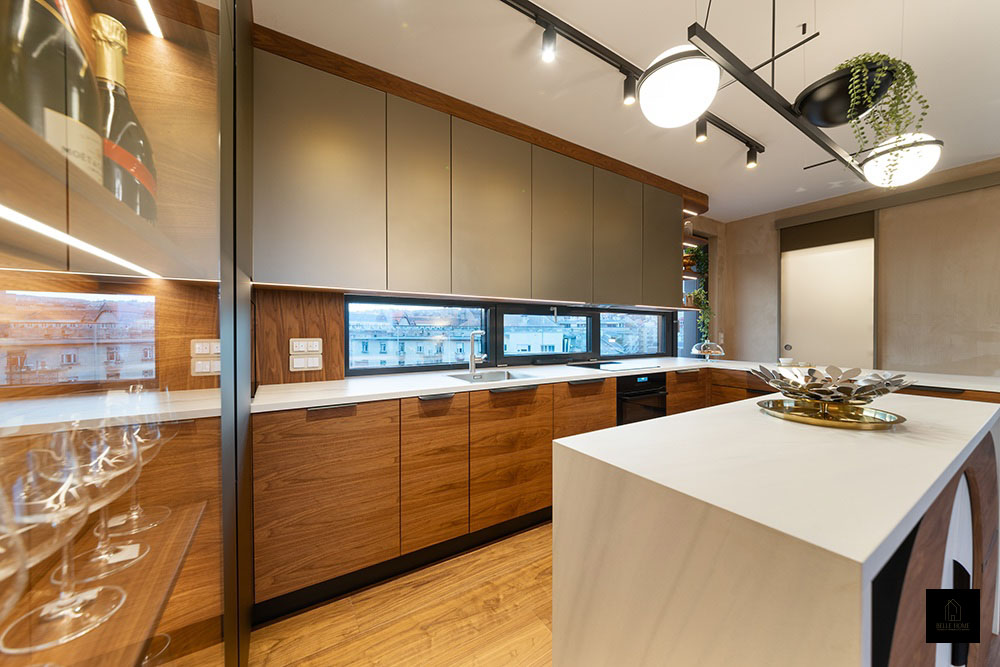 Ennek a lakásnak a központi eleme a konyha, így a tervezési koncepció is innen indult. Különlegessége az egyedileg készített konyhapult, amely óraként is funkcionál.